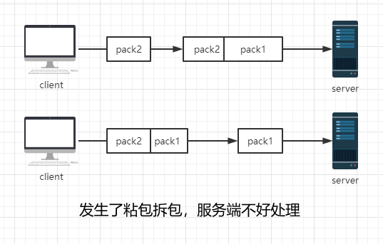 - 接收端只收到一个数据包,因为TCP不会丢包所以这个数据包包含了发送端发送的两个数据包,这就是粘包。服务端不知道怎么划分这两个数据包所以很难处理。