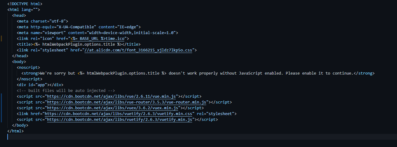 然后在public下面的index.html中配置插件的地址,可以用免费的cdn引入,推荐bootcdn传送门。