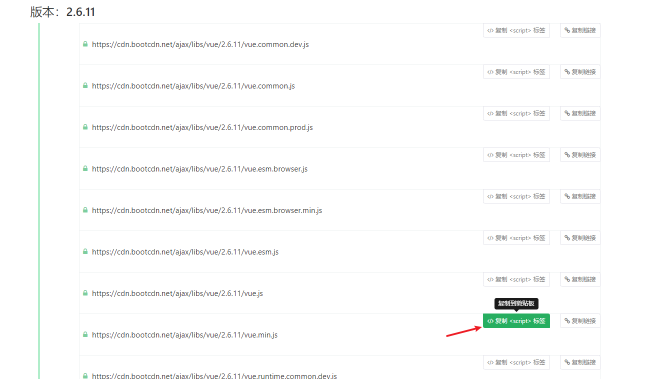 },2.6.11版本的,就打开bootcdn搜索vue,找到该版本并复制min.js