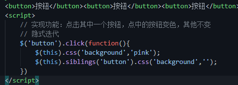 $('button').click(function(){ $(this).css('background','pink').siblings().css('background','');