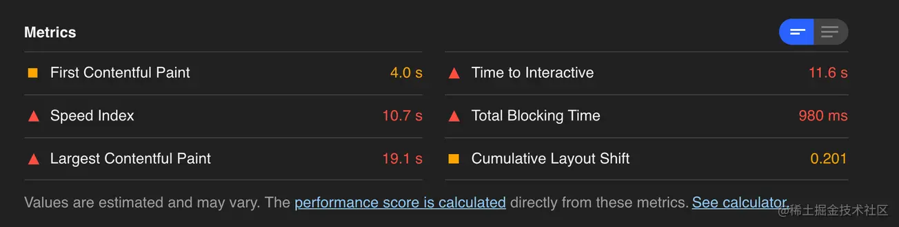 使用到了Lighthouse,这个是Chrome自带的性能指标获取器,会显示出具体的指标名称和时间,以及分数。