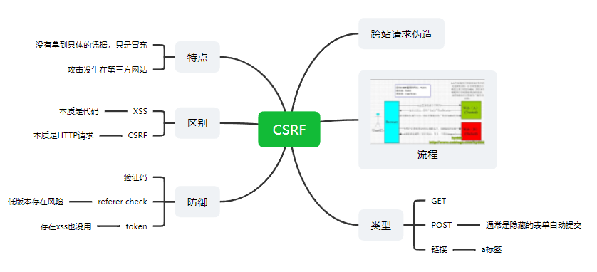 关键词:CSRF的由来、CSRF攻击流程、CSRF类型、CSRF特点、CSRF和XSS的区别、CSRF防御手段。