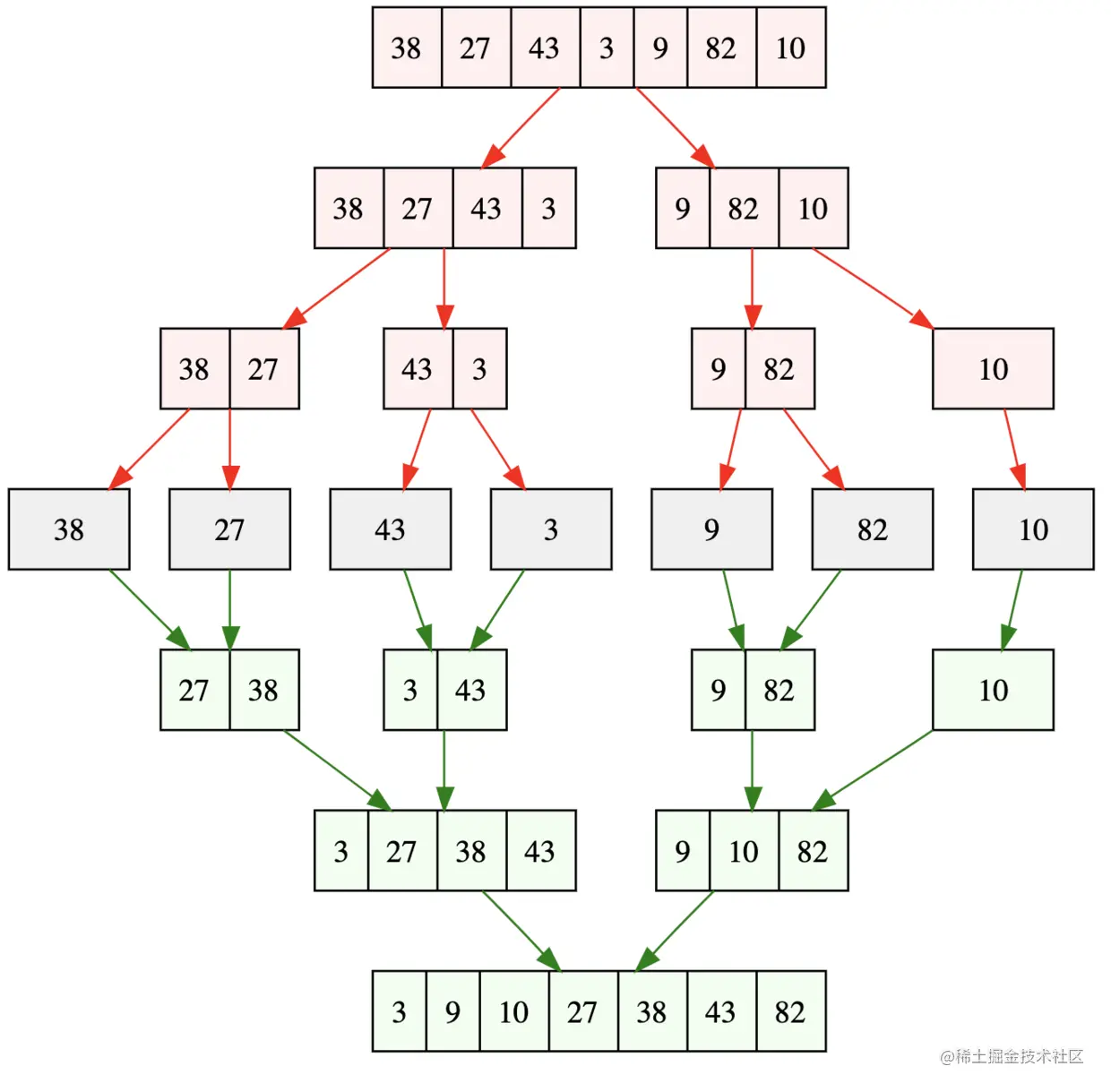 原理:采用分治思想,分解每个子问题,整个数组可以对半分割,一直到分割最小的状态,然后开始逐渐合并,从规模1到规模2一直到还原回整个数组。