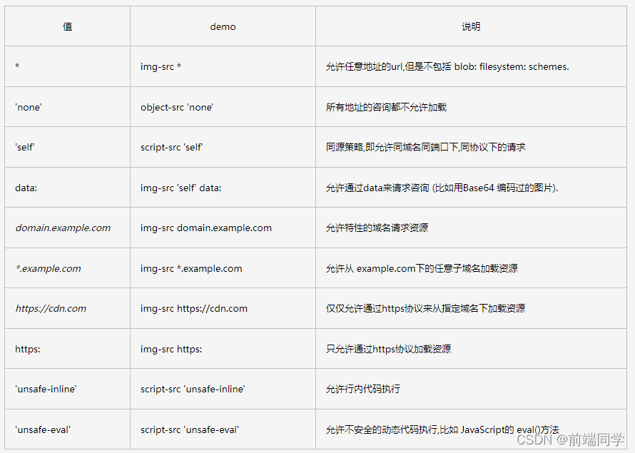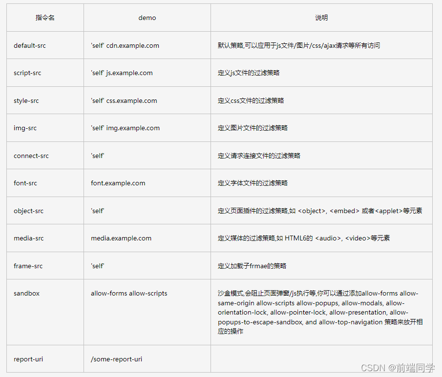 1 | <meta http-equiv="content-security-policy" content="策略集"> |