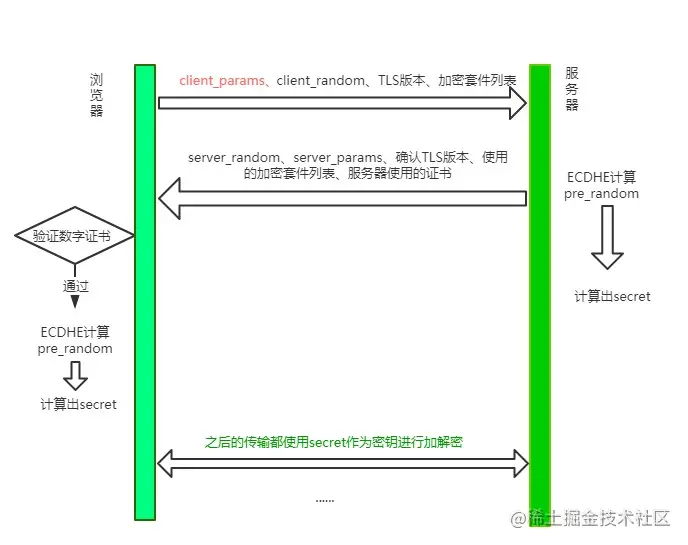 在客户端生成secret后,会给服务器发送一个收尾的信息,告诉服务器之后都要用对称加密,对称加密的算法就是用第一次约定的,服务器生成完secret后也会向客户端发送一个收尾信息,告诉客户端以后用对称加密来通信。