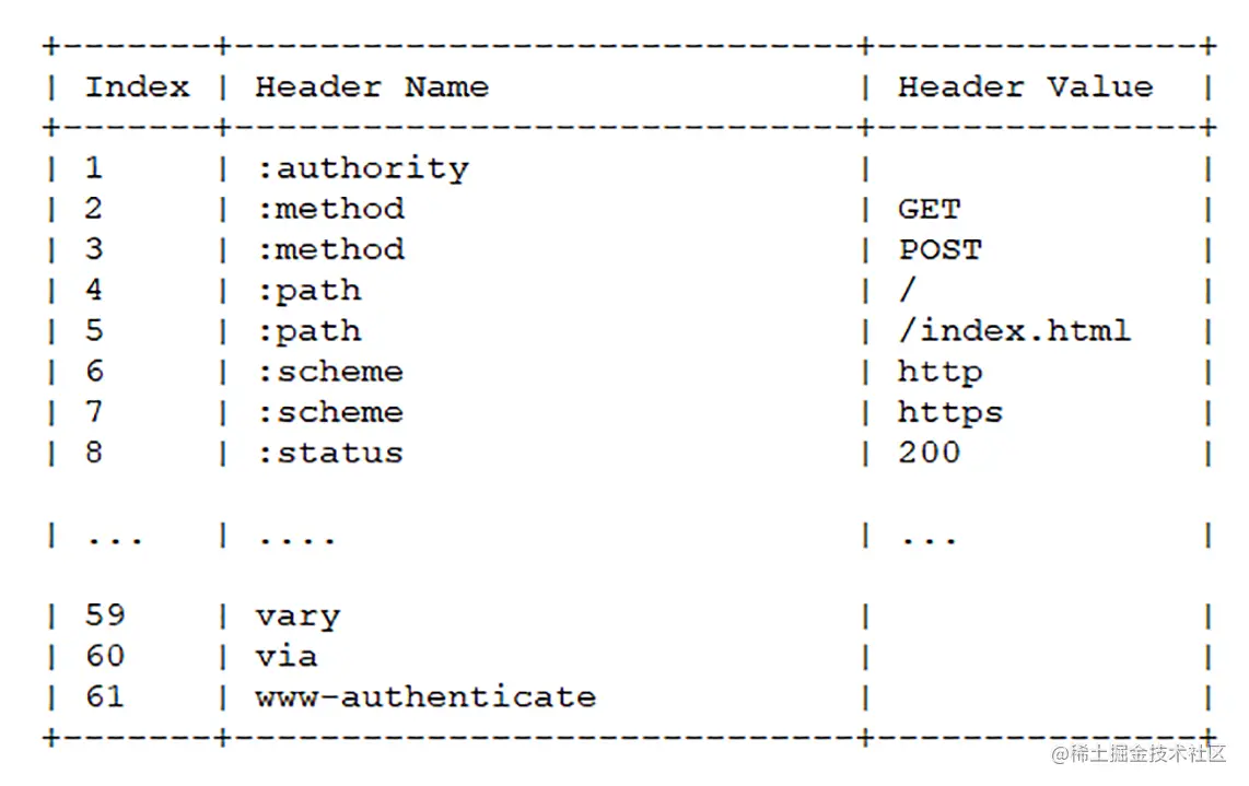 - 首先是在服务器和客户端之间建立哈希表,将用到的字段存放在这张表中,那么在传输的过程中对于之前出现过的值,只需要把索引传给对方即可,对方拿到索引表查即可。这种传索引的方式,可以让请求头的字段得到极大程度的精简和复用。