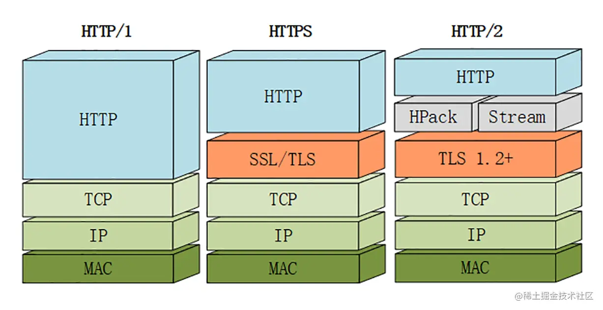 而HTTP2便从HTTP协议本身解决了这个问题。注意,这里并不是TCP阻塞,而是HTTP队头阻塞,两者并不是一回事。TCP的队头阻塞是在数据包层面,单位是数据包,前一个报文没有收到便不会将后面的报文上传给HTTP,而HTTP的队头阻塞是在HTTP请求响应的层面,前一个请求没有处理完,后一个请求就会被阻塞住。两者所在的层次不一样。