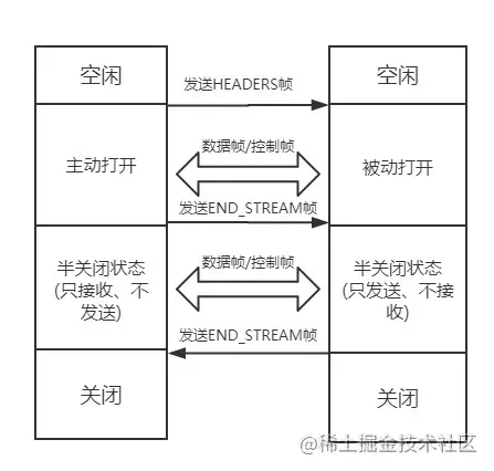 最开始两者都是空闲状态,当客户端发送Header帧后,开始分配Stream ID,此时客户端的流打开,服务端接收之后服务端的流也打开,两端的流打开后,就可以互相传递数据帧和控制帧了。