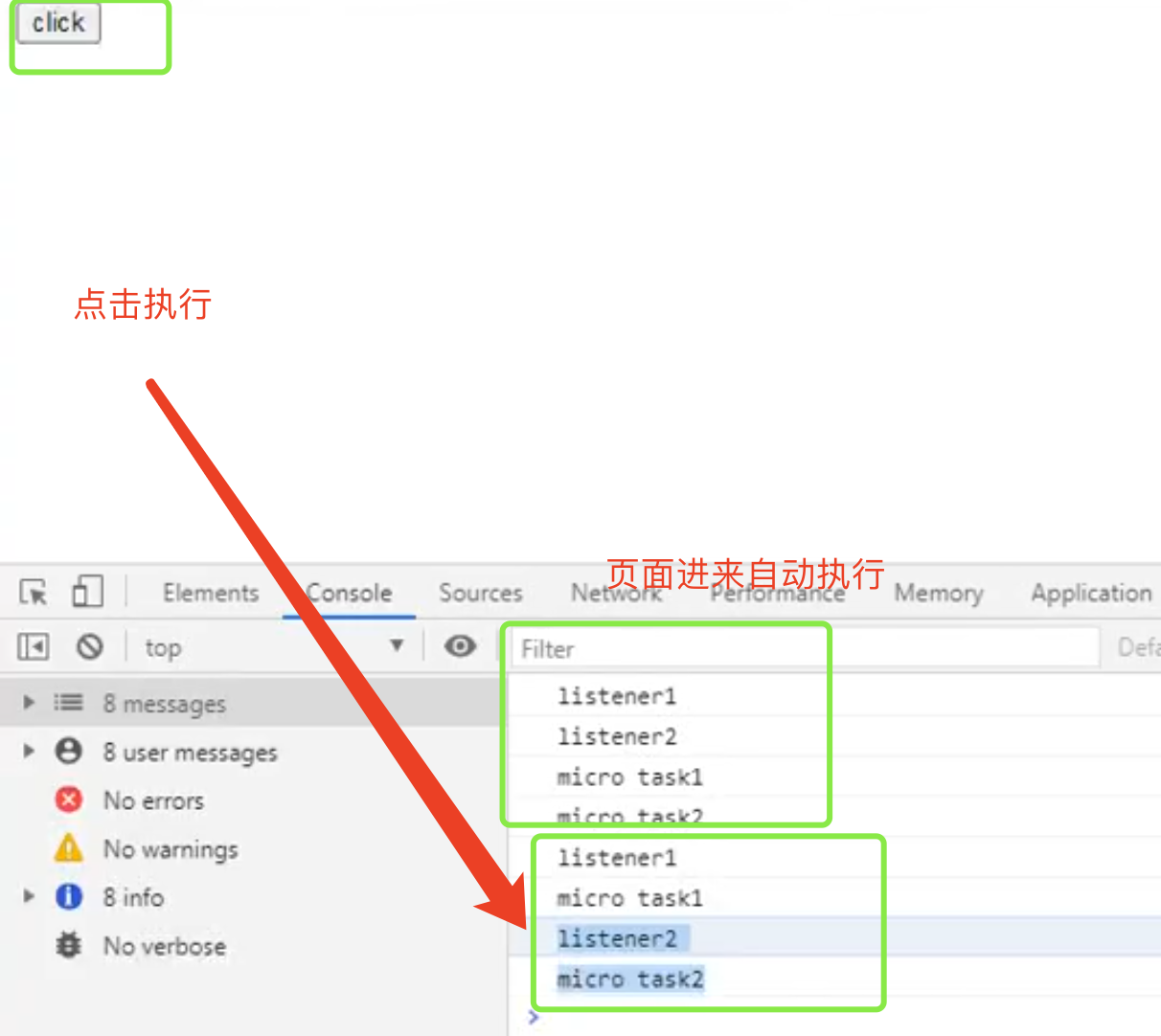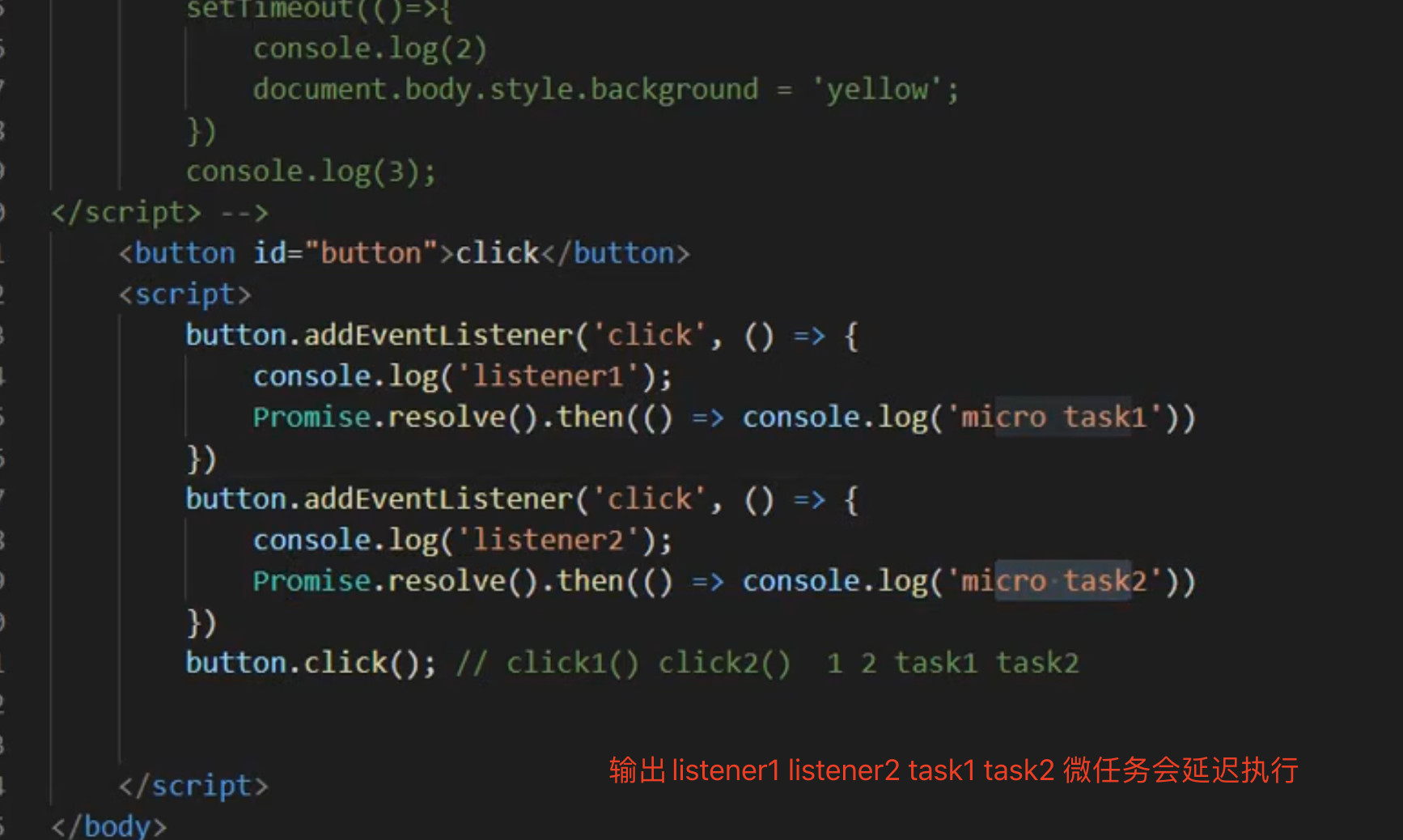 如果手动点击click 会一个宏任务取出来一个个执行,先执行click的宏任务,取出微任务去执行。会输出 listener1 task1 listener2 task2