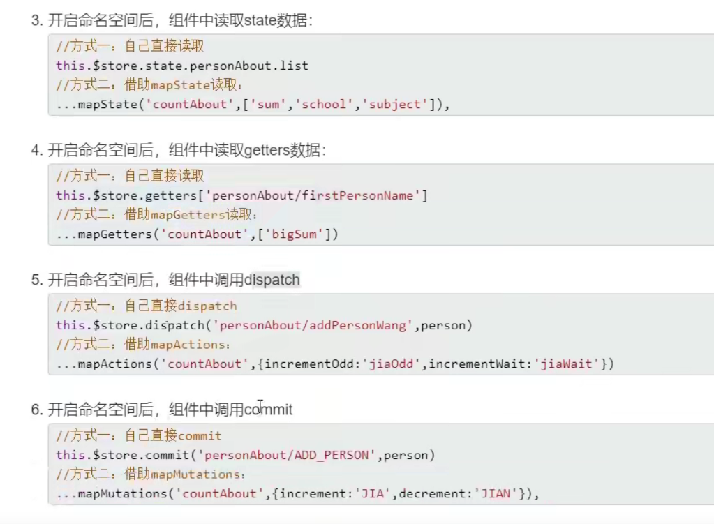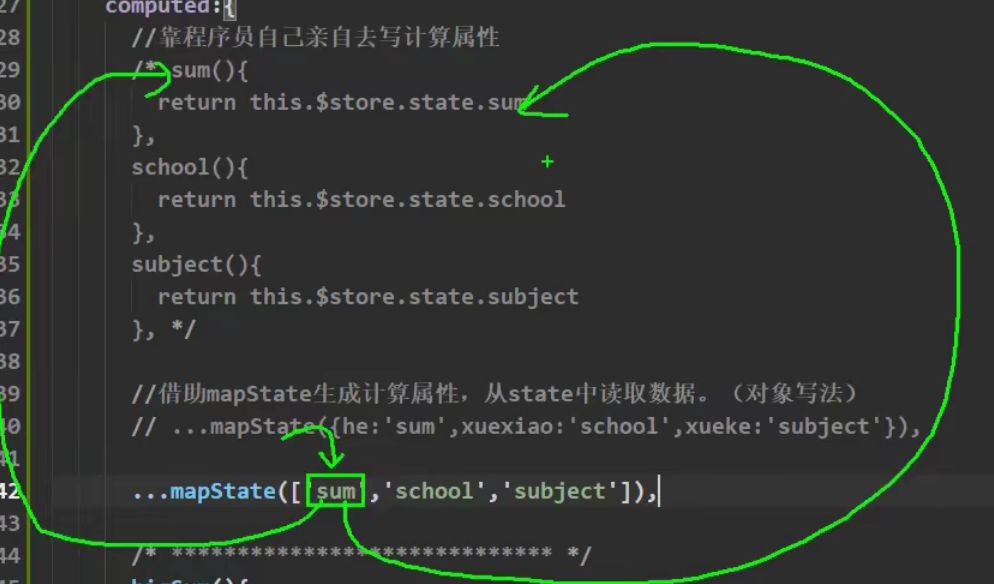 $store并且里面的state中有想要的sum值 可以插值语法直接获取 - vc如果先和action沟通 使用的是dispatch 并且第一个参数要和action里面的key对应