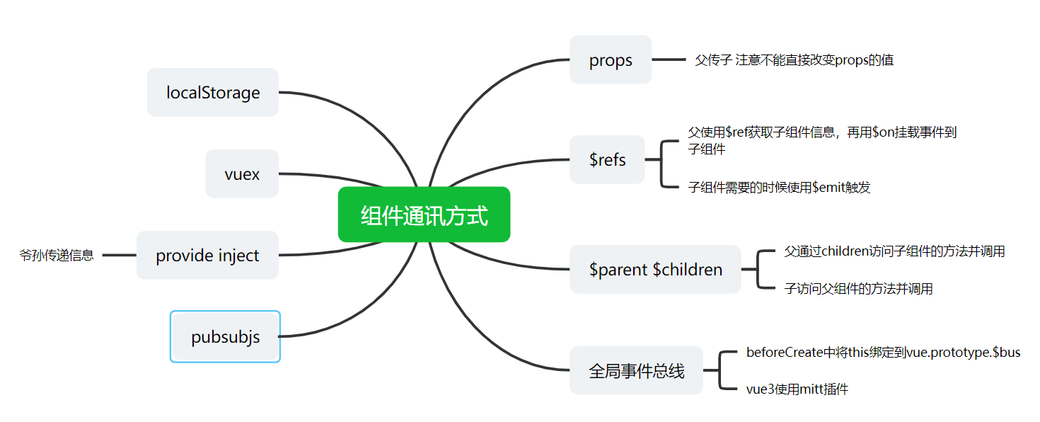 $refs获取子组件信息用$on挂载事件回调函数,子通过emit触发事件。 $parent,$children获取当前的父组件和子组件详细的方法并调用。- 全局事件总线(mainjs的beforeCreate里面挂载到vue实例上)(vue3取消 使用mitt插件)。