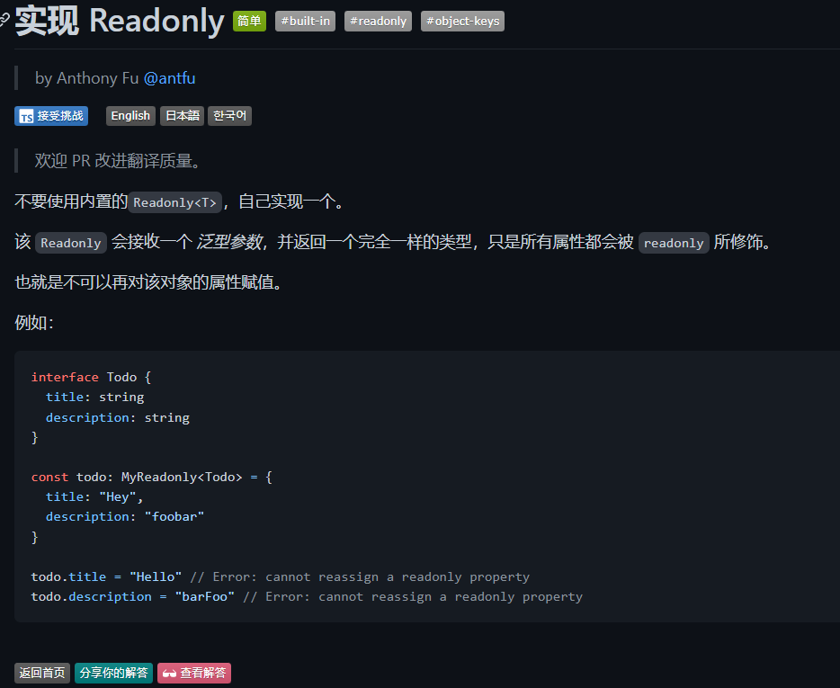 注意其实递归设置 readonly 是比较简单的,但是细节在于递归的设置,此处如果不是对象就返回初始类型
